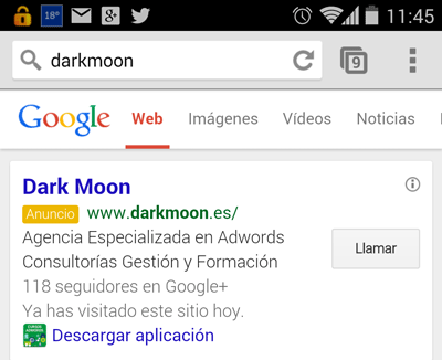 Segundo escenario , un usuario esta en el móvil. En este caso en el anuncio no aparece el número de teléfono tan solo el botón de llamar y de forma automática el sistema nos asigna un número de teléfono. Igualmente vamos a ser capaces de saber el número de llamadas , conversiones etc … Estos clics de llamada nos cuestan de momento lo que vale el clic , pero no se me da la impresión de que esto puede que no sea siempre así , el tiempo dira …