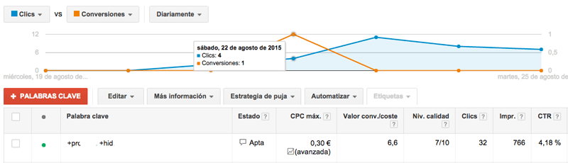 Entonces decido ampliar el periodo y me encuentro con una sorpresa , tengo una conversión asignada a esa palabra pero por un clic que se produjo hace unos días exactamente el día 22 de agosto, el día 23 de agosto si entrabas a mirar esa palabra no tenía ninguna conversión, es decir que adwords asigna conversiones a clics del pasado.