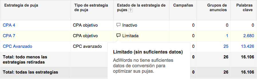 Mientras escribía este artículo el estado de las estrategias de pujas ha cambiado ahora me dice el sistema que no tiene datos suficientes para optimizar.