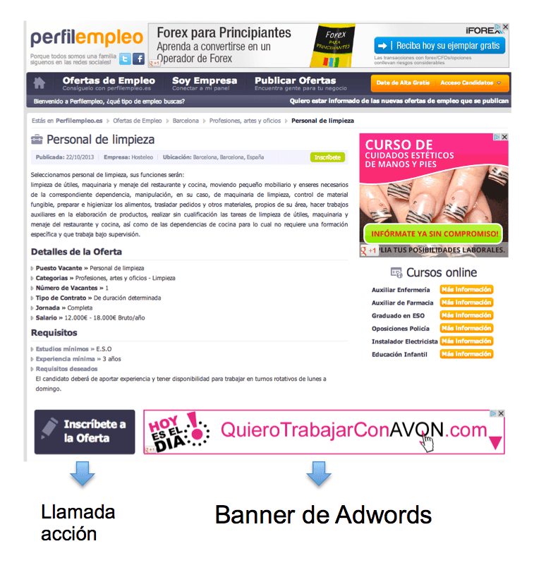 En la imagen superior vemos una oferta de trabajo , una llamada a la acción para apuntarte en la oferta de trabajo y a su lado un banner de adwords. Por suerte ese banner no tiene botón con llamada a la acción. Pero imaginemos al lado de inscríbete a la oferta un banner con un botón con otra llamada a la acción tipo: mas información, inscribirme, enviar solicitud … resultado el usuario piensa que se esta apuntando a una oferta de trabajo de limpieza y en realidad ha entrado a un sitio web donde se ha encontrado un formulario que ha rellenado sin llegar a fijarse en el contenido y texto de la web. Y esto se puede llegar a identificar solamente si trabajas con una base de datos donde guardas todas las solicitudes y su procedencia y eres capaz de identificar que de x ubicación te están llegando muchas solicitudes no válidas porque el usuario dice que buscaba otra cosa o que el no relleno esa solicitud.