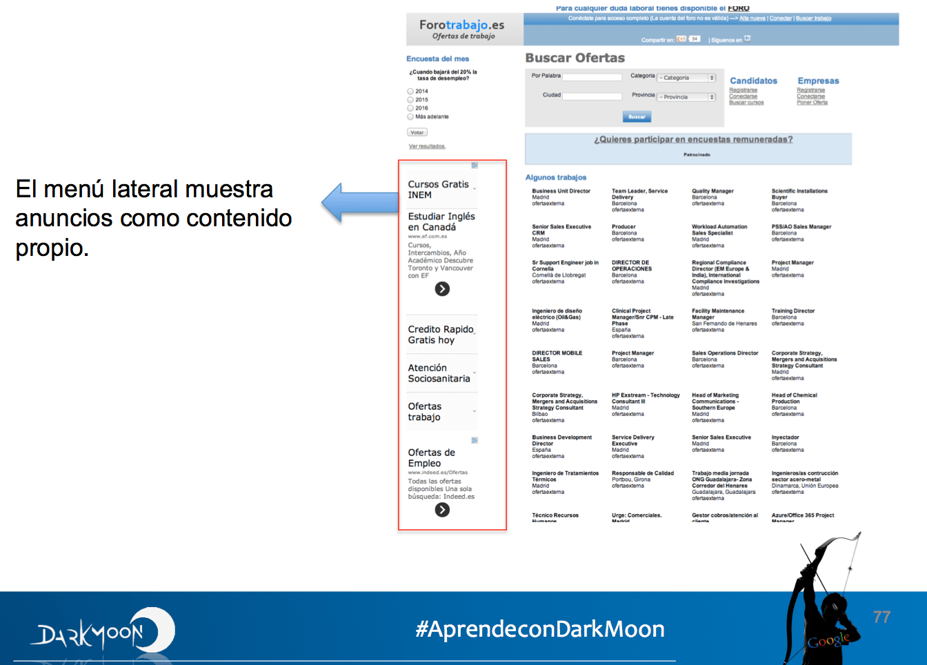Ahora lo que vemos es una oferta de empleo , una llamada a la acción y un anuncio camuflado y digo camuflado porque google permite cambiar los colores de los anuncios que aparecen en la red de adsense permitiendo fusionar anuncios con contenido de la web. Aprovecho este artículo para mostrar mi desacuerdo con este tipo de permisos que mal utilizados contribuyen a incrementar el fraude.