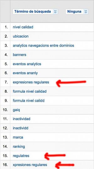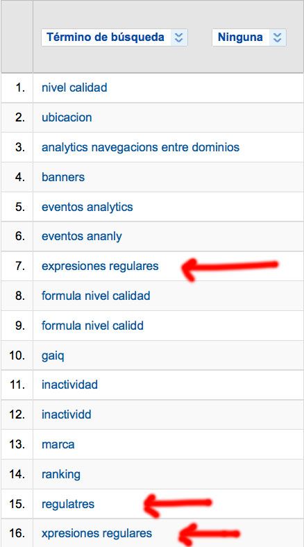 Bien pues en este informe me llama la atención que se esta buscando informacion sobre las expresiones regulares en analytics , comodines que se utilizan en los filtros de analytics para hacerlos coincidir con fragmentos de un campo. Yo por ejemplo utilizo unos muy buenos para en las tiendas de comercio electronico poder saber mas cosas de las transacciones realizadas. Bien pues esto es motivo de un proximo articulo.