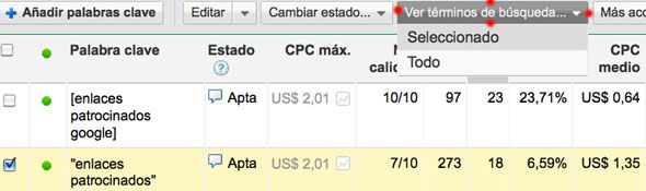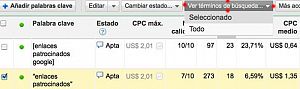 Nos saldra un desplegable con los terminos que activaron nuestros anuncios de adwords , si usamos concordancia de frase o amplia podremos ver realmente lo que el usuario busca. Estos datos nos sirven no solo para optimizar adwords sino tambien para mejorar nuestro sitio web.