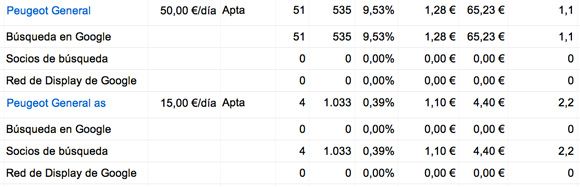 En el ejemplo estamos pujando un 60% de lo que pujábamos en la campaña original , y como resultado hemos conseguido bajar un poco el cpc y descender una posición en comparación con Búsqueda de Google.