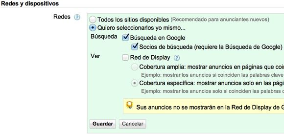 La conclusión al ver esta configuración es que no podemos anunciarnos solamente en la red de Socios de Búsqueda.
