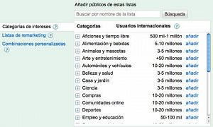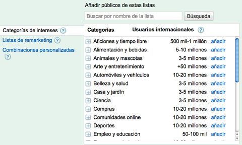 Desde esta ventana podemos elegir los publicos que nos interesen y añadirlos. Lo mejor para tenerlo todo controlado es crear una campaña aparte con sus grupos de anuncios solo para la red de display.