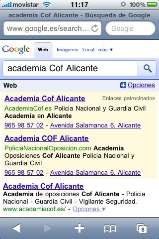 En la siguiente imagen (captura de pantalla desde un Iphone) podemos ver como justo debajo del anuncio aparece el numero de telefono de la empresa , pues bien solo tenemos que poner el dedo encima el numero de telefono para que nuestro terminal inicie una llamada. Quien iba a pensar esto hace 5 años ?