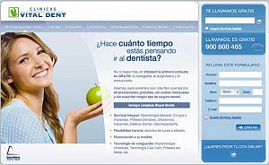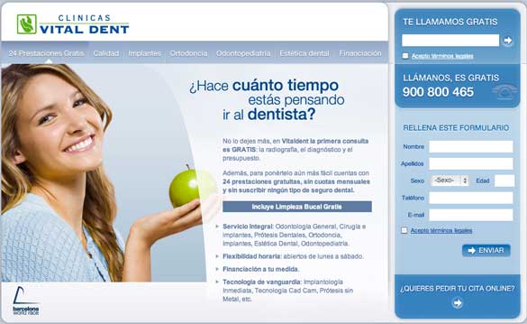 Podriamos crear una campaña en google adwords y enviar a los usuarios a la home o a partes concretas del sitio web corporativo y no tendriamos malas conversiones pero sin ninguna duda se podrian mejorar , una pagina corporativa no es el mejor sitio para enviar a usuarios por los que estemos pagando en adwords. Y es por ello que Clinicas Vital Dent ha desarrollado una pagina de aterrizaje que roza la perfección desde mi punto de vista puede que se pueda mejorar realizando tests A-B o multivariable pero vamos que el sitio web es una maquina de hacer dinero.