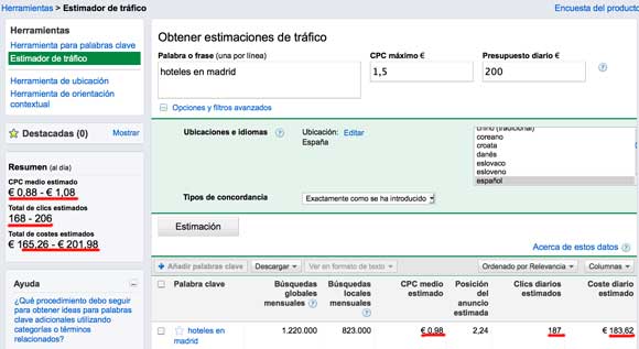 Despues de unas cuantas pruebas puedo decir que la herramienta ahora nos da una estimacion de entre el 70% y el 100% del gasto real que nos daria esa palabra clave, el dato que da esta muy bien ya que es un dato aproximado y la herramienta no puede tener en cuenta factores internos de nuestra cuenta como pudiera ser la configuracion de la cuenta, se me ocurre por ejemplo que cambiar entre el metodo de publicacion estandard o acelerado pueda influir notablemente en la cantidad de clics diarios. Los niveles de calidad de la cuenta lo mismo , el sistema imagino que tomara valores normalizados pero dependiendo de valores como la relevancia de nuestras palabras clave – anuncios – landing pages o incluso historial de la cuenta si esta no fuera nueva. Son muchos factores que nos alejan del valor 100% real que es imposible de predecir.