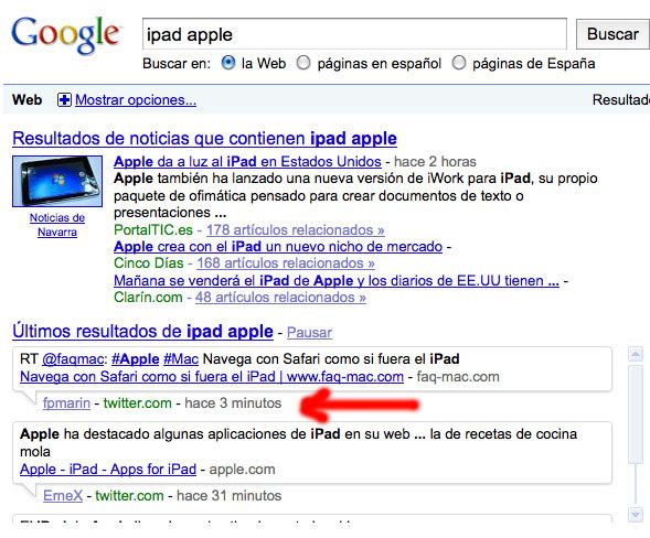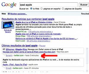 Por cierto si queréis ver en funcionamiento una nueva característica de google buscar con los términos «ipad google» hay un scroll que nos muestra cada pocos segundos o minutos las ultimas noticias de la red en tiempo real extraidas de blogs , twitter etc … Impresionante.