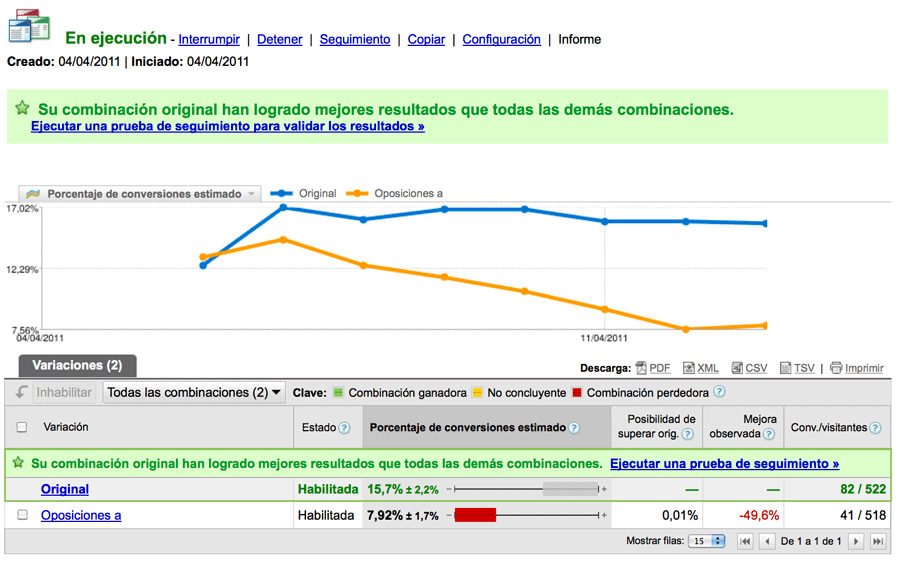 Podemos hacer dos tipos de test el que os muestro es el mas sencillo un A/B se pone a competir la pagina original con una variacion de esta , pero tambien podemos hacer test mas avanzados donde probemos combinacion de multiples elementos como sean 4 titulos , 5 imagenes , 2 videos , diferentes contenidos de texto etc … El sistema buscaria la mejor combinacion de todos los elementos para darnos la formula exacta de exito. Y es que uno de los errores mas comunes es tomar como valido el resultado de nuestro trabajo pensando que lo que hemos elegido nosotros es decir lo que nos gusta a nosotros es lo que mejor funciona y eso solo lo pueden decidir los usuarios que visitan nuestra pagina.