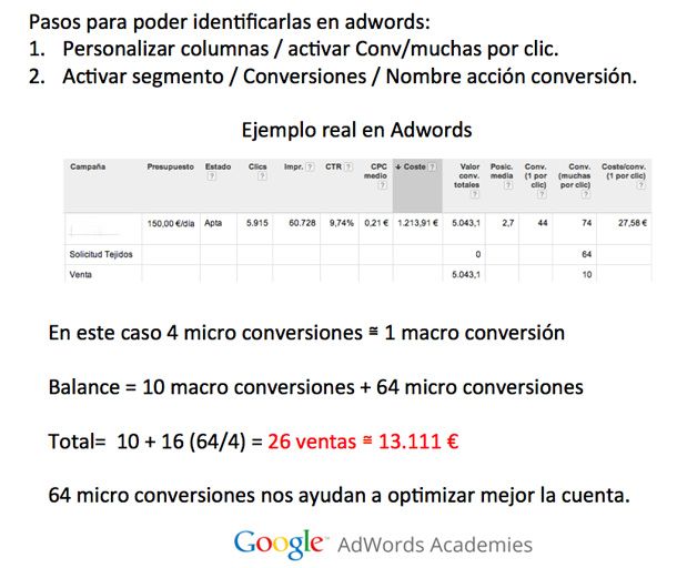 Como podemos ver normalmente trabajamos con macro conversiones que suelen ser 1 venta , 1 solicitud de información , 1 llamada etc… Pero podríamos pasar a trabajar con otras conversiones que podríamos llamar micro conversiones , las micro conversiones son mas faciles de alcanzar , al llevar todas estas micro conversiones a la interface de adwords vamos a poder trabajar de una forma mas eficaz ya que vamos a tener mas información sobre la eficacia de nuestras campañas.
