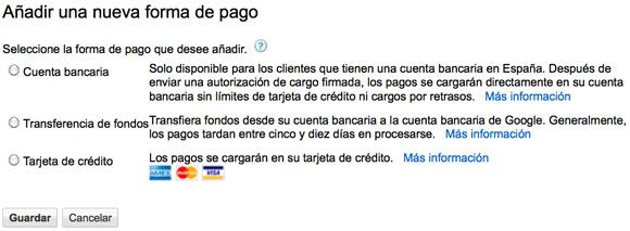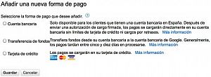Otra de las novedades es que podemos añadir una segunda forma de pago teniendo la posibilidad de elegir de primaria por ejemplo cuenta bancaria y como segundo metodo por si falla este tarjeta de credito. Ya era hora al cliente a la hora de pagar hay que darle todo tipo de facilidades y el sistema de pagos de google adwords ciertamente estaba bastante obsoleto.