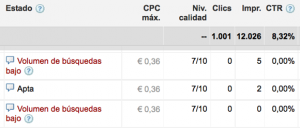 Entonces nos vamos a fijar en palabras clave que cumplan estos requisitos , nivel de calidad 7/10 o inferior , pocas impresiones ,pocos clics o ninguno o directamente adwords nos indica en rojo Volumen de búsquedas bajo. Bien pues todas estas palabras clave las eliminamos de nuestra cuenta , porque no nos están aportando trafico suficiente como para que tenga valor , no nos están dando conversiones posiblemente. ¿ Porque mantenerlas ? Eliminarlas va a hacer que mejore el historial de nuestra cuenta.