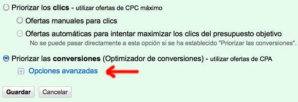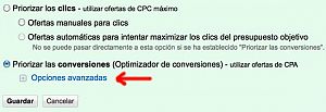 Encontraremos el CPA de orientación en la configuracion de campañas bajo un link llamado Opciones avanzadas.