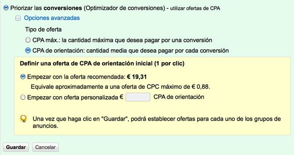 Si el CPA Max es la cantidad máxima que se desea pagar por una conversión , el CPA de orientación es la cantidad media que se desea pagar por conversión.