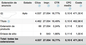 Ahora en cambio el sistema ya nos da estadísticas (Clic, impresiones, CTR, CPC medio, conversiones etc ), por lo que el panorama ha cambiado, ahora podemos optimizar con datos fiables, y asociar las extensiones a los anuncios que nos den un mejor rendimiento y eliminar las que no nos aporten lo que necesitamos.