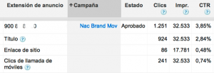 En esta captura podemos ver las estadisticas de una extension de llamada, y de las veces que esta se ha activado junto a la extensión de enlaces a sitios, claramente la mayor parte de los clic se reciben sobre el titulo del anuncio.
