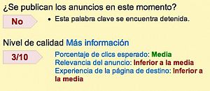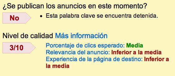 De esta forma podemos saber en que aspectos podemos mejorar. Veamos un ejemplo de una palabra clave que se encuentra penalizada porque la página de destino no esta optimizada , no es relevante para el termino de búsqueda y por tanto la experiencia del usuario cuando llegue a ella google puede determinar que no es la mejor ya que hay anunciantes que podrían estar mejor que nosotros , por lo tanto lo que tenemos que hacer es mejorar la página de destino.