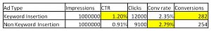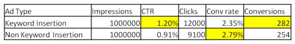 Por otra parte leo en Search Marketing un interesante articulo donde se tiene un factor en cuenta CTR y porcentaje de conversiones y es que podemos tener un anuncio con un Porcentaje de conversiones alto pero un CTR bajo que nos podria dar menos cantidad de conversiones que un anuncio con peor porcentaje de conversiones pero mejor CTR.