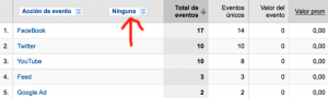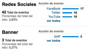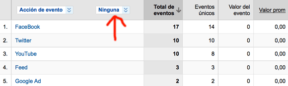 Nos vale de ejemplo este blog , arriba vemos varios botones que corresponden a diferentes redes sociales , en este caso tenemos que medir los clics que salen de nuestro sitio web a otra web desde la que no podemos medir la llegada de esos clics. Para conseguir medir los clics que salen de nuestro sitio utilizaremos el seguimiento de eventos de google analytics. El seguimiento de eventos se ve desde la seccion de contenido de nuestra cuenta de analytics. Y algunos de los datos que recogen son estos: